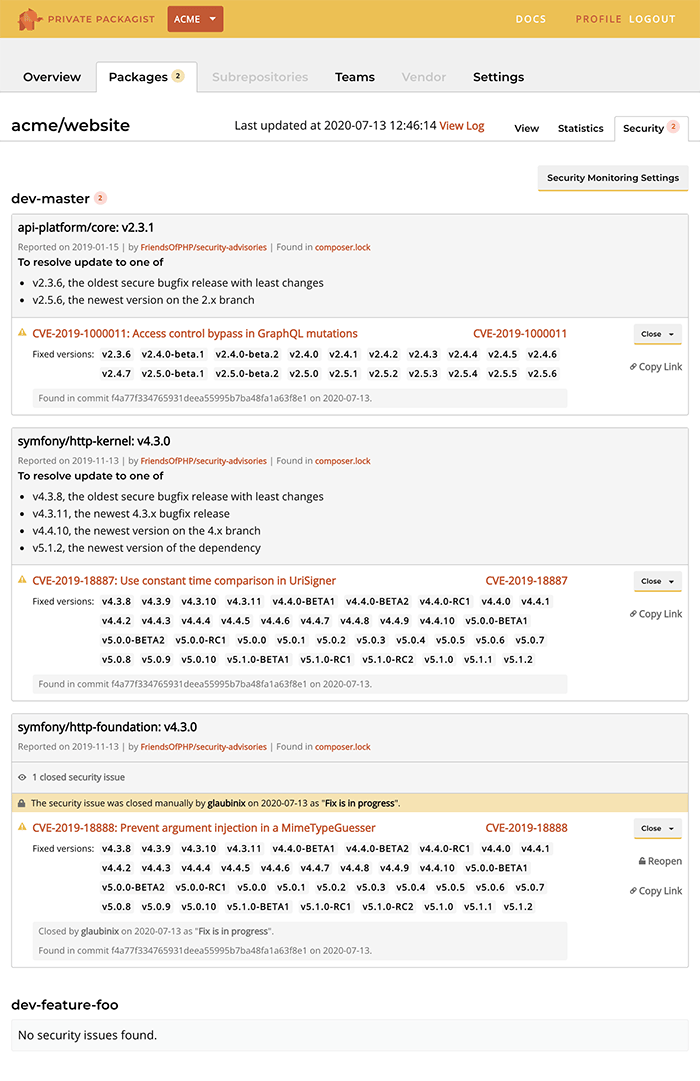 Private Packagist alerts you when security vulnerabilities are reported for Composer dependencies in your projects.